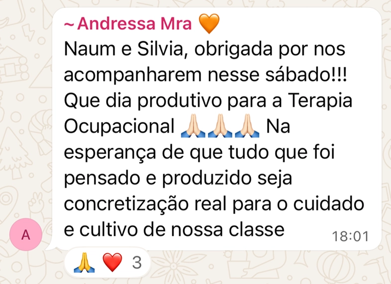 Essas experiências me mostraram algo muito claro. A Terapia Ocupacional tem força, mas precisa de profissionais que acreditem nessa força, que levem nossa atuação para além da clínica, que enxerguem o impacto social, político e humano do que fazemos.